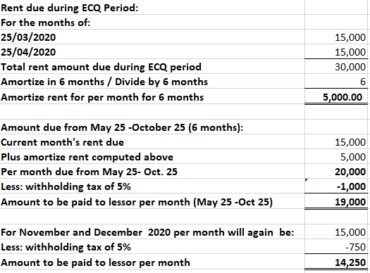 While cumulative rents falling due within the ECQ period will be amortized for 6 months which would added to your current rent due for the month.