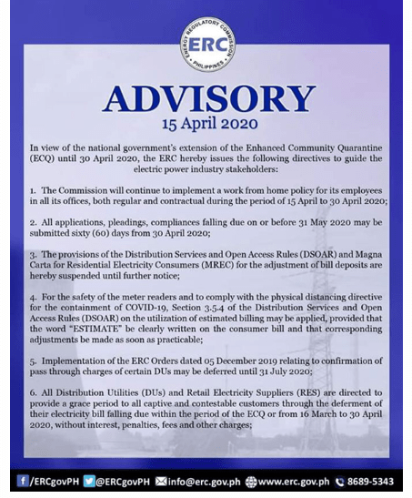 The Energy Regulatory Commission’s directed all distribution utilities and retail electricity suppliers to provide a grace period to its customers through deferment of their electricity bill falling due within the ECQ period or from March 16 to April 30, 2020.
