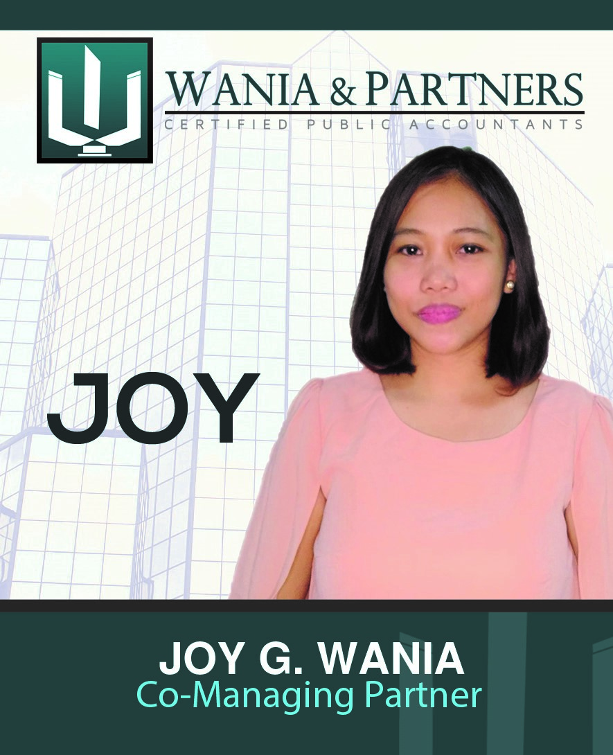 Joy Wania is a Certified Public Accountant graduated Cum Laude – Bachelor of Science in Accountancy from Universidad De Manila. Joy has over three years of rich experience in corporate tax specializing in tax audits of retail industries in accordance to the regulations of the Bureau of Internal Revenue (BIR), Local Government Unit (LGU) and other regulatory agencies. Prior to establishment of Wania and Partners, Joy was a part time Faculty Member of Universidad De Manila in 2013-2014 and a freelance accountant for various SME’s, providing end to end service from business registration to regulatory tax filings.